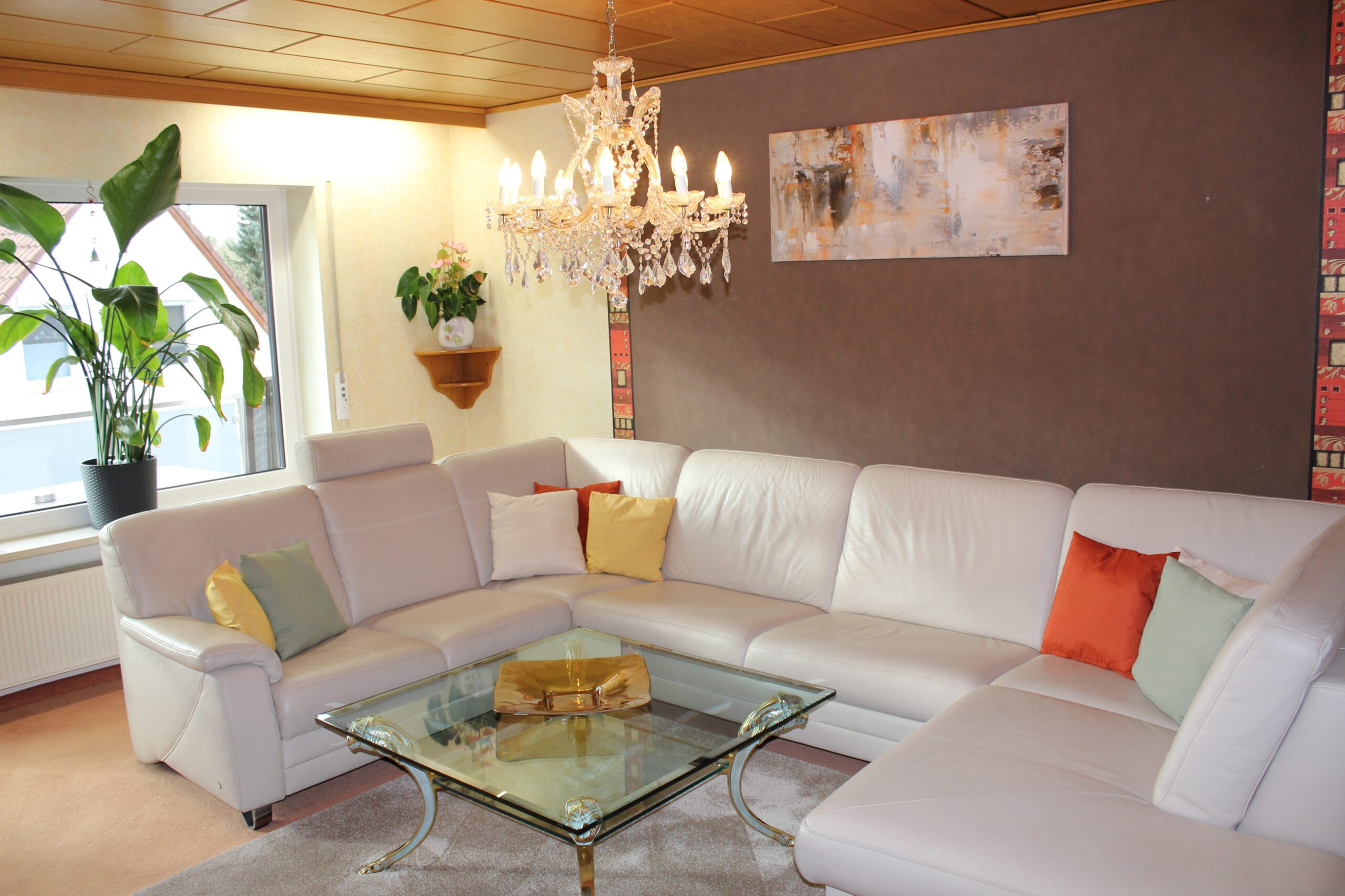Wohn-Esszimmer mit großem Ecksofa, Flachbildfernseher Essplätze für 6 Personen.